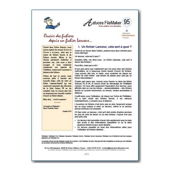 Un lanceur, ça sert à quoi ? Question bête, cela sert à lancer des fichiers ! Oui mais alors, quel intérêt ? FileMaker 14 avec sa gestion de solutions le fait très bien… Oui, mais on le fait encore mieux par script, puisqu'on peut alors ouvrir plusieurs fichiers en un seul clic, décider d'afficher ou de masquer des fenêtres et même… d'ouvrir un fichier incognito !…