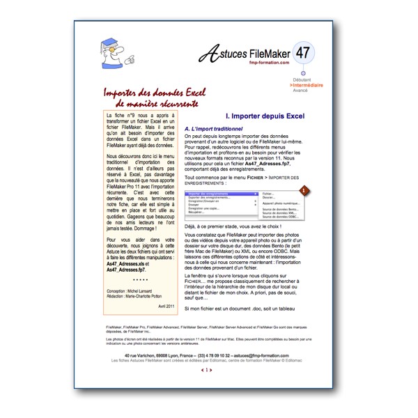 Avec la fiche n°9, nous avions vu comment créer un fichier FileMaker depuis un fichier Excel. Ici, il s'agit d'importer les données Excel (ou autres) dans un fichier FileMaker préexistant. Outre l'import classique, nous voyons l'import récurrent de la version 11. Cette fiche est livrée avec deux fichiers.