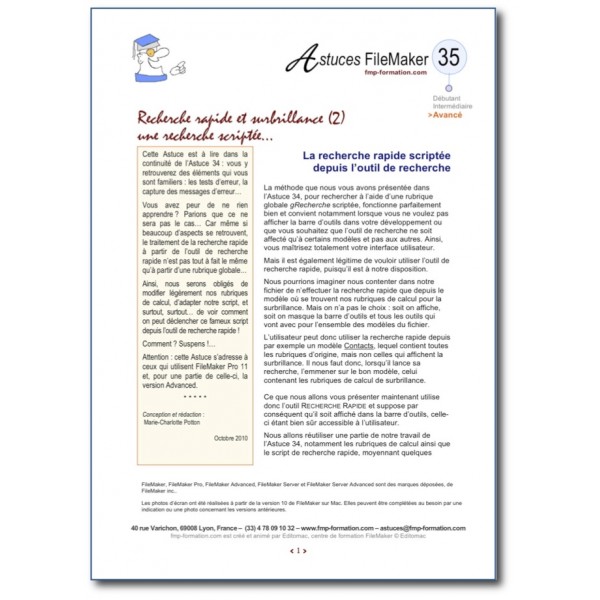 Cette Astuce est la suite de l’Astuce 34 sur la Recherche rapide et la surbrillance, mais elle permet d'aller plus loin, grâce entre autre au déclencheur de script et au jeu de menus personnalisé. Elle est livrée avec deux fichiers FileMaker.